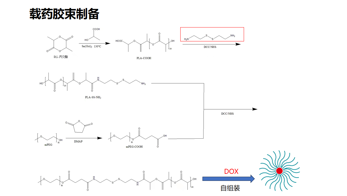 (1)ROS响应型核交联聚合物胶束的制备与研究:研究团队针对肿瘤微环境中活性氧簇(ROS)水平高于正常细胞的特点,设计并合成了基于硫缩酮键的ROS响应型两亲性载体材料mPEG-b-PTK。通过光交联法,这些材料能够自组装形成核交联胶束,有效包裹抗癌药物阿霉素(DOX),并展现出良好的生物相容性和稳定性。在ROS存在的情况下,硫缩酮键能够迅速断裂,导致胶束结构解体并释放药物,从而在肿瘤部位实现精准的药物递送。实验结果表明,这种核交联载药胶束在HeLa细胞中具有出色的内化能力,对正常细胞的毒性较低,而对癌细胞的毒性较高,显示出良好的抗癌活性。此外,该载药系统还能实现疏水性小分子药物和亲水性大分子药物的分区共载,有望实现两种不同药物的协同治疗作用。尽管如此,该载药系统的生物降解性和体内抗肿瘤效果仍需进一步研究,以验证其在临床应用中的潜力。[3]