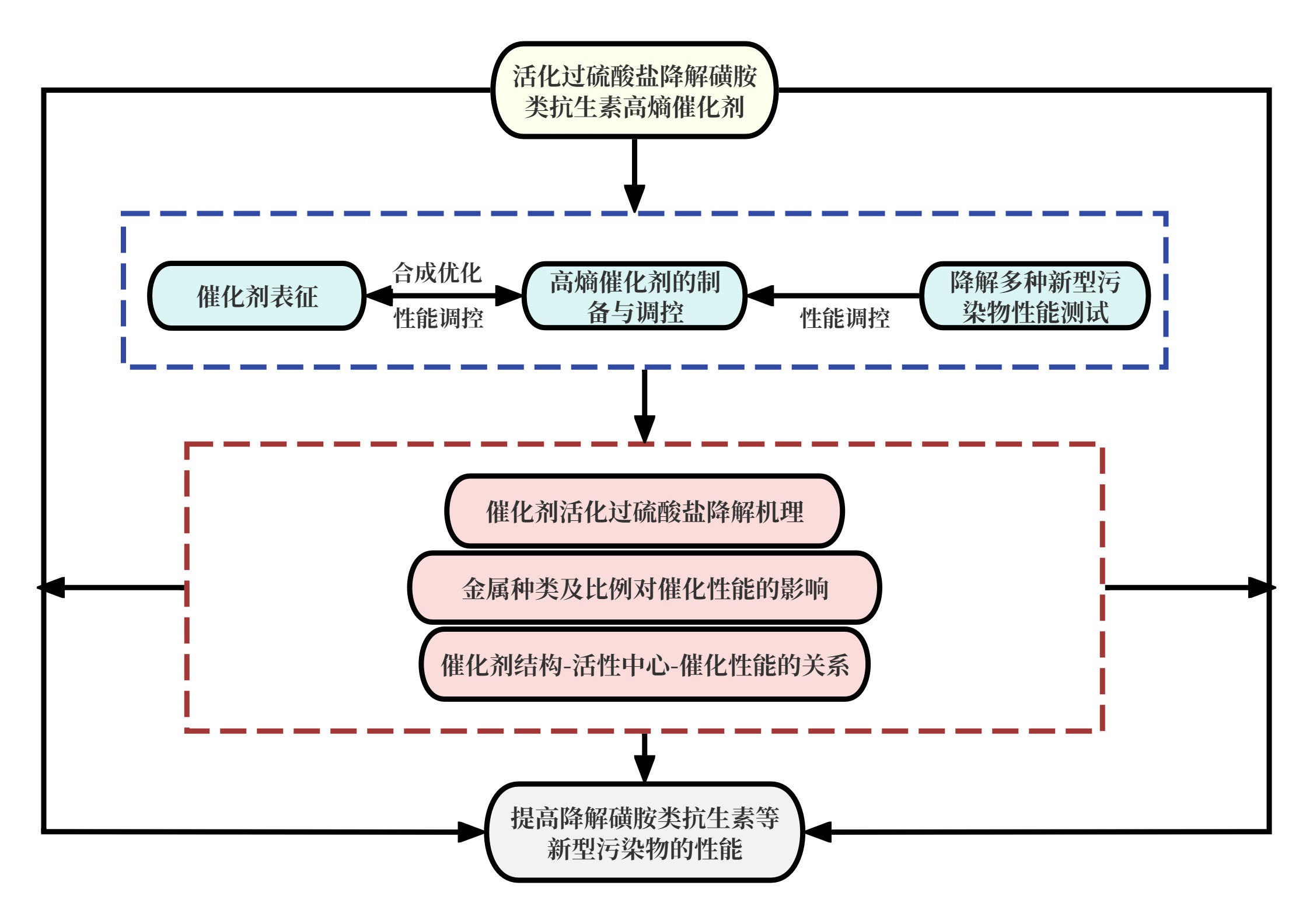 通过调控金属元素的种类与比例,设计出能够降解磺胺类抗生素的催化剂。包括催化剂的活性组分选择,催化剂的合成方法设计,催化剂载体选择及结构调控等;