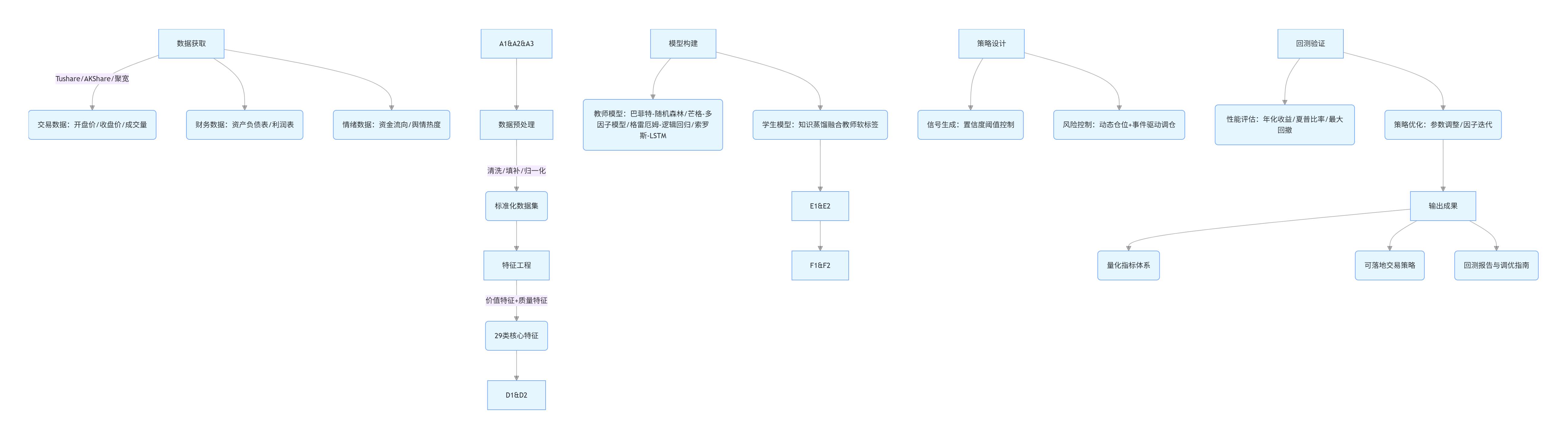 ? 数据获取:通过 Tushare 获取 A 股日线 / 分钟线交易数据(开盘价、收盘价、成交量),聚宽平台获取上市公司财务数据(资产负债表、利润表、现金流量表),新浪财经 / 东方财富获取市场情绪数据(资金流向、舆情热度);